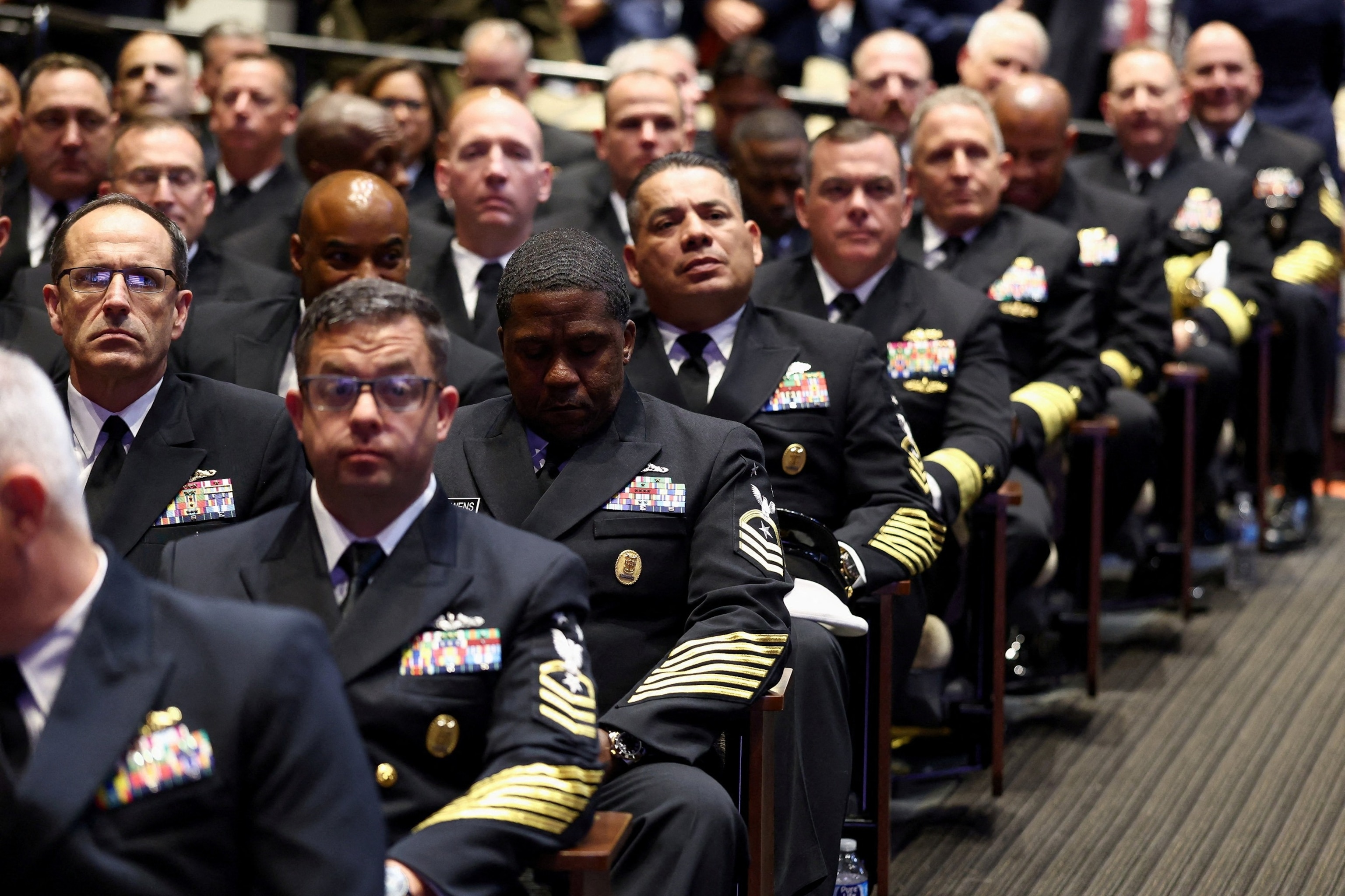 Military members listen as President Donald Trump addresses senior military officers gathered at Marine Corps Base Quantico in Quantico, Virginia, September 30, 2025.
