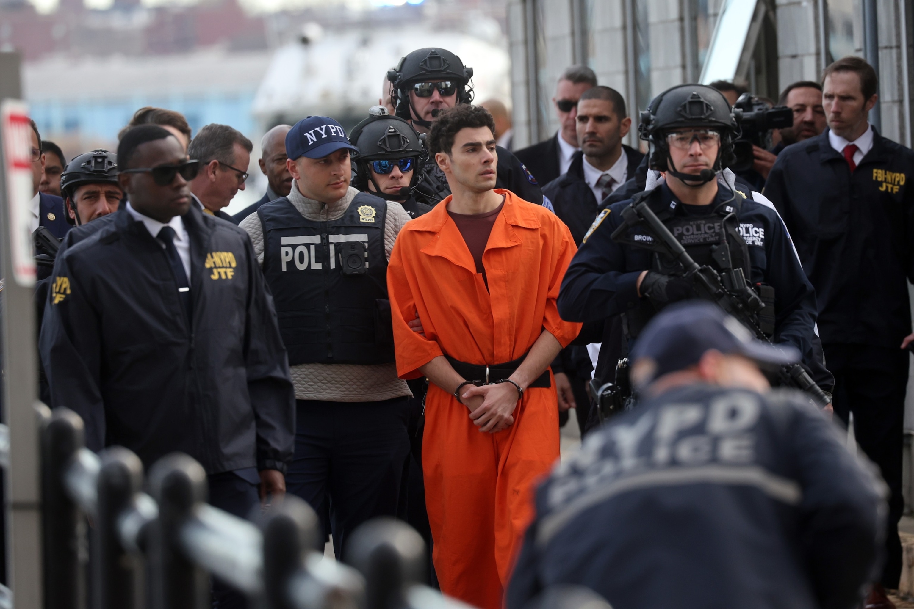 Luigi Mangione, suspect in the killing of UnitedHealthcare CEO Brian Thompson in New York City, arrives at a heliport with members of the NYPD, Dec. 19, 2024, in New York.