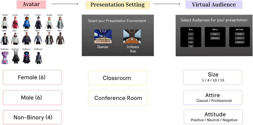 As shown in Figure 1, Participants could select from 6 female avatars, 6 male avatars, and 4 non-binary avatars, the latter featuring non-human forms like a purple teddy bear or a robot. They could also choose between a classroom or conference room environment, which dynamically changed based on their selection. Furthermore, participants had the option to choose the audience size (1, 4, 10, or 15 members), their attire (casual or professional), and audience behavior (positive, neutral, or negative).