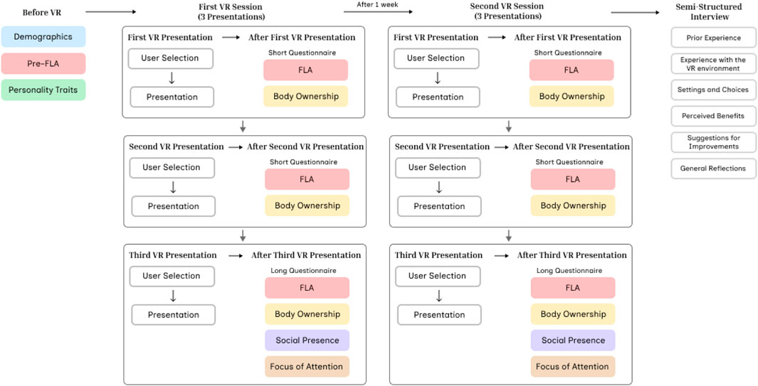 Prior to the VR experience, participants were provided with detailed project information outlining potential risks. They signed an informed consent form, which assured data security, anonymity, and the right to withdraw at any point. Participants then completed a pre-questionnaire that gathered demographic information, language background, previous VR experience, FLA levels and personality traits.