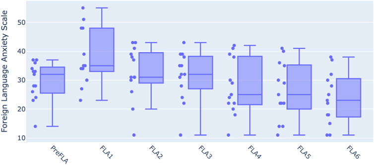 FLA has been studied with different computer-mediated communication modalities, such as audio and video conferencing platforms, and virtual worlds (Kaplan-Rakowski and Gruber, 2023). The study examined how different settings, such as VR or Zoom, affected participants’ FLA levels. Speaking in VR resulted in significantly reduced anxiety levels than practicing speaking on Zoom.