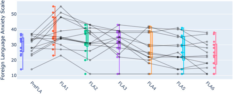 Our primary focus was on the changes in self-reported FLA levels throughout the VR trials. Participants completed the FLA questionnaire seven times: once before the experiment (preFLA) and immediately after each VR session during their two visits to the lab (FLA1-3 after the first visit, and FLA4-6 after the second). We ran a reliability test for all FLA measurements, and found all Cronbach’s alpha greater than 0.8.